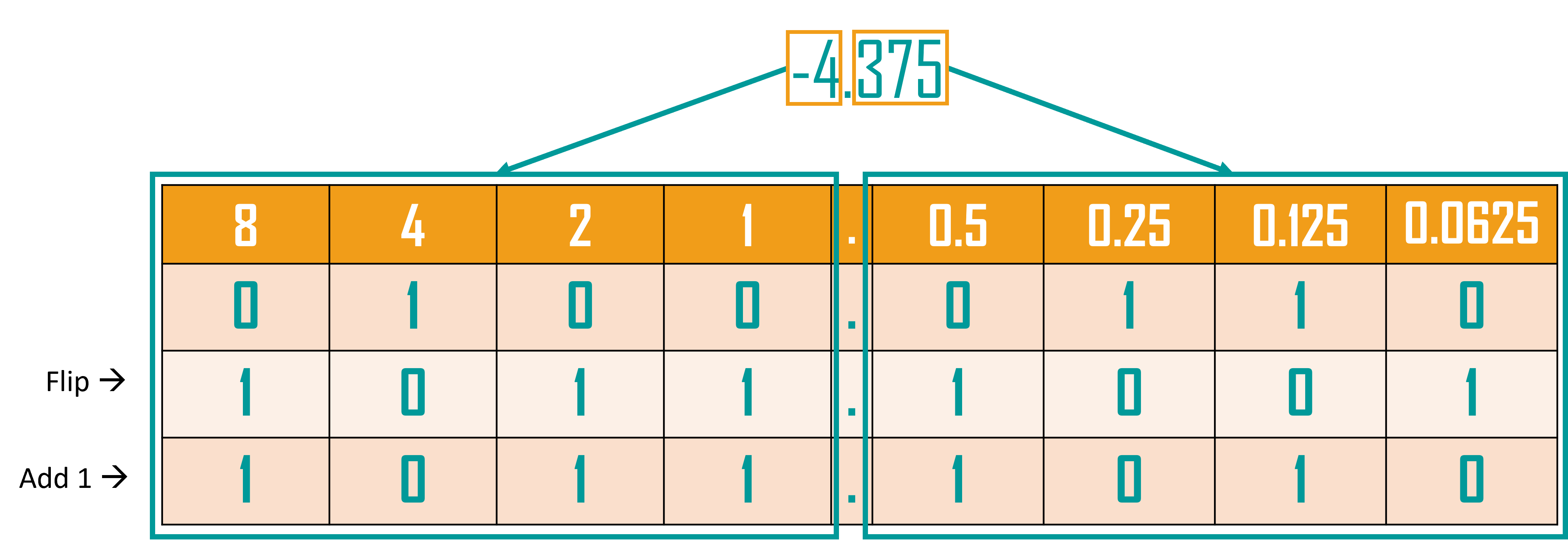 Why use binary floating-point numbers Fixed-point binary allows computers to represent fractions but has a limited range. Even with 4 bytes (32 bits) and 8 bits for the fractional part, the largest representable number is just over 8 million. This limitation makes it unsuitable for very large numbers. Floating-point notation overcomes this by using a mantissa (main digits) and an exponent (position of the decimal point), similar to scientific notation in decimal. For example, 0.12 × 10¹⁵ has 0.12 as the mantissa and 10¹⁵ as the exponent. In binary, two bytes (16 bits) can be divided into 10 bits for the mantissa and 6 bits for the exponent, allowing a much wider range of numbers to be represented efficiently. Converting binary floating-point to decimal 1) Find the sign of the mantissa (write it down) 2) Write down the mantissa. If the mantissa is negative, convert the two's complement over it. 3) Find the exponent value. If the exponent is negative, convert the two's complement over it. 4) Move the floating point in the mantissa to the distance that defines the exponent (point 3), left for negative exponent, right for positive. 5) Calculate the whole part and the fractional part. Put a sign (point 1) Calculate the value of the number Example 1. Mantissa is positive, Exponent is positive
