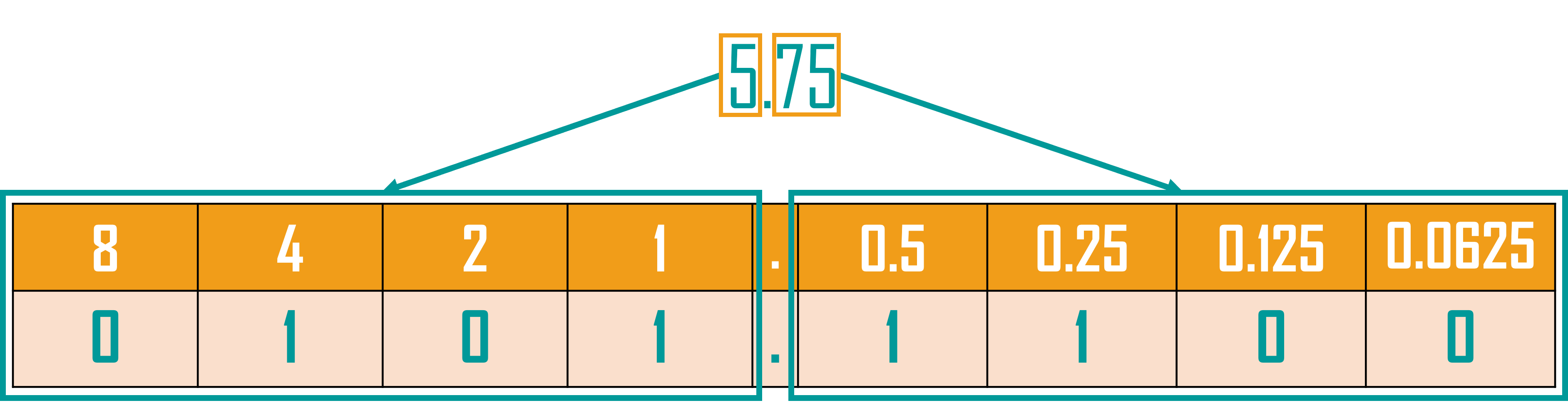 Examples. Using one byte to hold each number, with an imaginary binary point fixed after the fourth digit, convert the following unsigned decimal numbers to binary. 5.7510 = 0101.11002